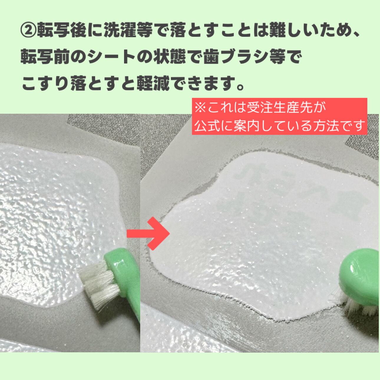 転写後に洗濯等で落とすことは難しいため、転写前のシートの状態で歯ブラシ等でこすり落とすと軽減できます。